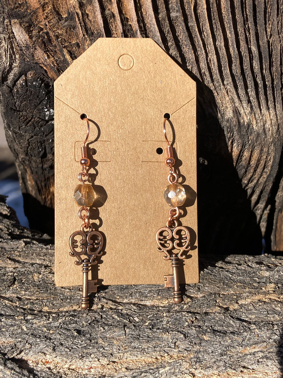 Copper Filigree Key Earrings with Golden Beads – Woodland Inspired Earrings